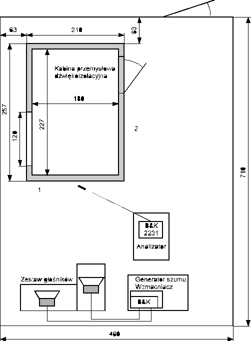 Rys.Z.3. Szkic laboratorium Hałasu Niskoczęstotliwościowego z dźwiękoizolacyjną kabiną przemysłową i aparaturą pomiarową