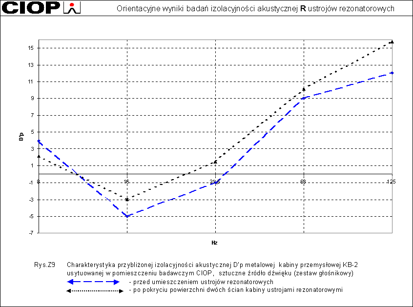 Charakterystyka przybliżonej skuteczności akustycznej kabiny KB-2 po zainstalowaniu ustrojów rezonatorowych przedstawiona jest na rys. Z.9. Jak widać skuteczność kabiny wzrosła o ok.2-3 dB w zakresie niskich częstotliwości.