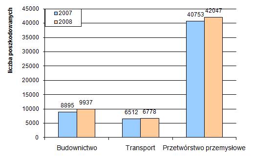 Rys. 1. Poszkodowani w wypadkach przy pracy ogółem w budownictwie, transporcie i przetwórstwie przemysłowym, w latach 2007 – 2008.