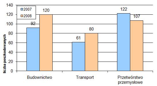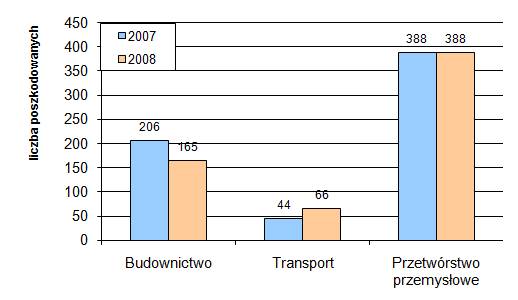 Rys. 2. Poszkodowani w ciężkich wypadkach przy pracy w budownictwie, transporcie i przetwórstwie przemysłowym, w latach 2007 – 2008