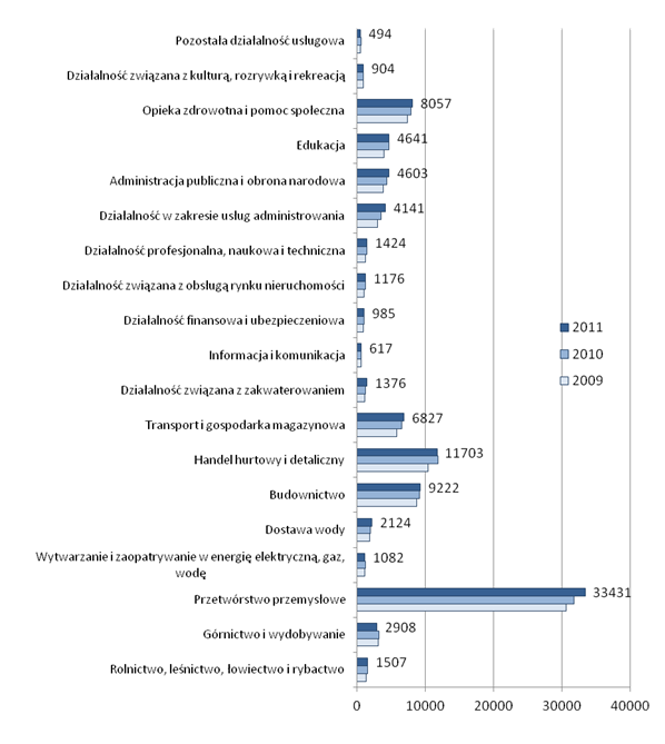 Sekcją, w której od lat rejestruje się największą liczbę wypadków przy pracy jest przetwórstwo przemysłowe (rys. 5). W roku 2011 w sekcji tej zarejestrowano ponad 33 tys. wypadków przy pracy, czyli niemal 3 razy więcej niż w drugiej co do liczby wypadków sekcji handlu hurtowego i detalicznego.