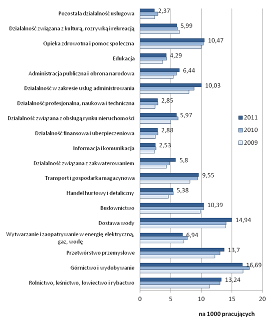 Rys. 6. Wskaźnik wypadków przy pracy w wybranych rodzajach działalności gospodarczej w Polsce w latach 2009 i 2011