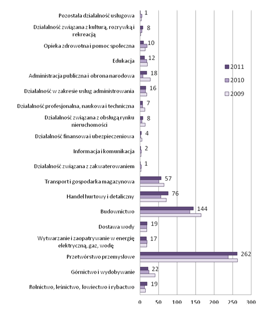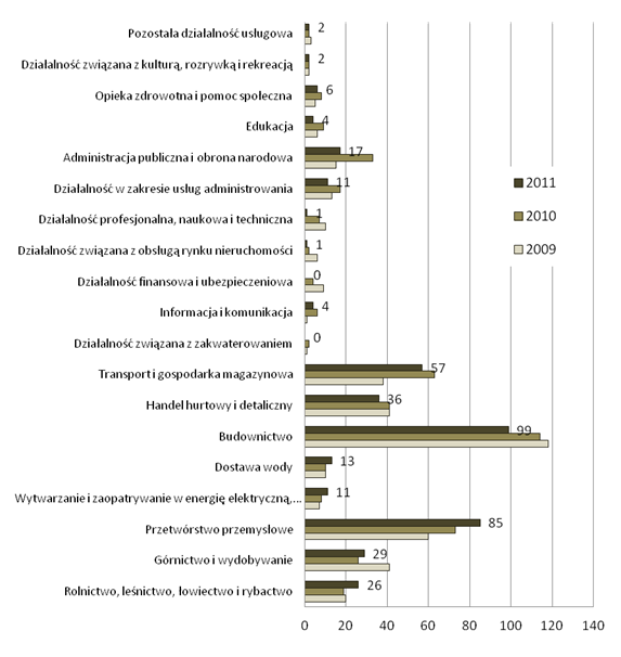 Rys. 8. Liczba wypadków śmiertelnych w wybranych rodzajach działalności gospodarczej w Polsce w latach 2009 - 2011