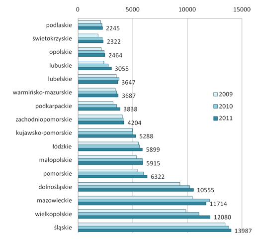 Rozkład przestrzenny liczby wypadków przy pracy w latach 2009 - 2011 wskazuje, że województwem, w którym doszło do największej liczby wypadków jest województwo śląskie (rys. 9). Liczba pracowników poszkodowanych w wypadkach przy pracy w roku 2011 wyniosła w tym południowym województwie niemal 14 tys.