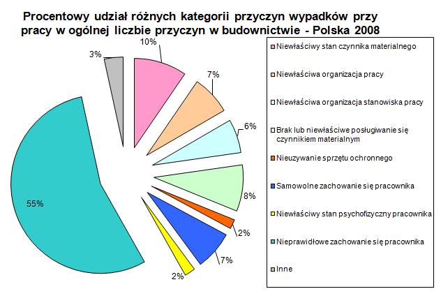 W budownictwie nieprawidłowe zachowanie się pracownika stanowi 55% wszystkich przyczyn. Następne w kolejności są przyczyny związane z czynnikiem materialnym -niewłaściwy stan czynnika materialnego (10%) oraz brak lub niewłaściwe posługiwanie się czynnikiem materialnym (8%). Relatywnie wysoki jest też udział przyczyn organizacyjnych, tj.: niewłaściwej organizacji pracy (7%) oraz niewłaściwej organizacji stanowiska pracy (6%).
