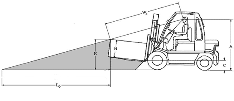 B - wysokość położenia najwyższej krawędzi ładunku znajdującego się na widłach wózka;