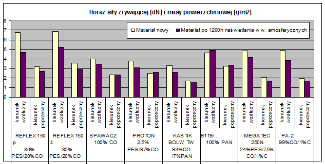 Rys. 8 Wartości ilorazu siły zrywającej [N] i masy powierzchniowej [g/m2] materiałów nowych i po ekspozycji na działanie światła i czynników atmosferycznych w warunkach naturalnych przez 1200 h.