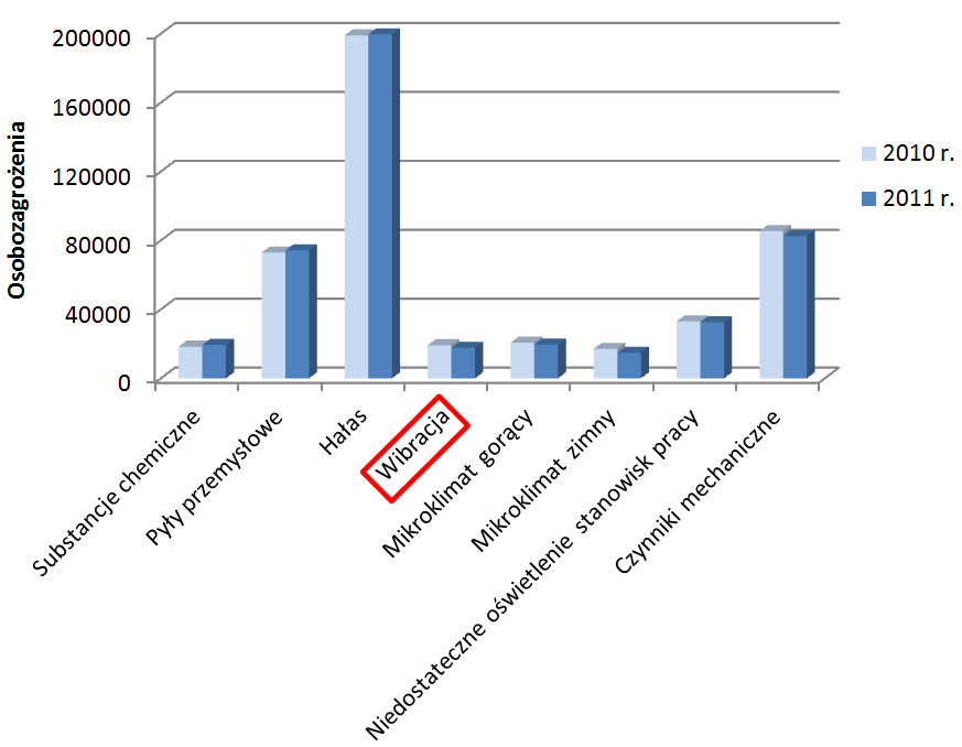 Z wykresów na rys. 1 i rys. 2 wynika, że drgania mechaniczne (wibracja) jest siódmym pod względem liczby zagrożonych pracowników czynnikiem szkodliwym środowiska pracy. W 2011 roku na drgania mechaniczne było narażonych 17655 pracowników. Wg danych GUS, w ostatnich latach liczba pracowników zagrożonych drganiami mechanicznymi utrzymuje się na podobnym poziomie.