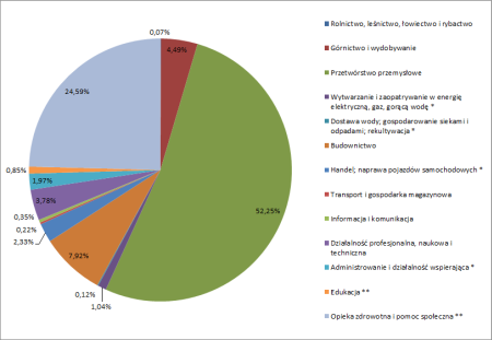 Rys. 1. Procentowe udziały zatrudnionych w warunkach zagrożenia na promieniowanie optyczne (UV + IR) w stosunku do zatrudnionych w zagrożeniu na promieniowanie (jonizujące + laserowe + UV+ IR)w poszczególnych działach gospodarki w 2011 r.