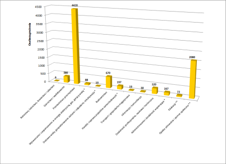 Rys. 2. Liczba zatrudnionych w warunkach zagrożenia na promieniowanie optyczne w poszczególnych działach gospodarki w 2011 r.