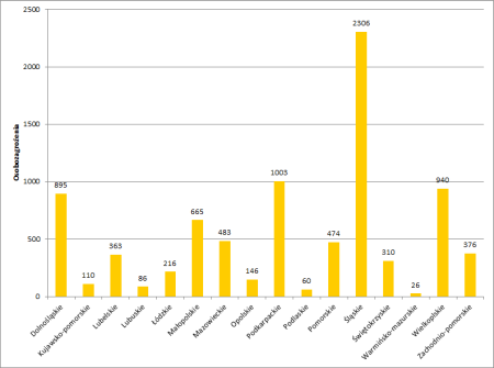 Rys. 3.Liczba zatrudnionych w warunkach zagrożenia na promieniowanie w poszczególnych województwach i w 2011 r.