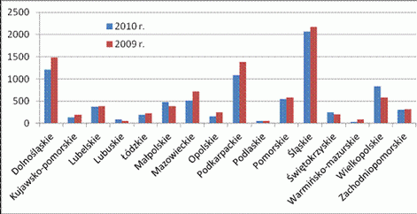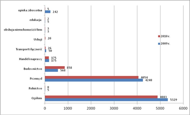Rys. 4. Liczba zatrudnionych w warunkach zagrożenia na promieniowanie w poszczególnych działach gospodarki w 2009 r. i 2010 r.
