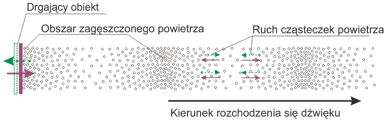 Dźwięki to drgania cząstek powietrza (lub innego ośrodka sprężystego) względem położenia równowagi. Drgania te propagują się w powietrzu w postaci fal akustycznych, czyli następujących po sobie lokalnych zagęszczeń i rozrzedzeń cząstek powietrza. Prędkość z jaką rozprzestrzeniają się drgania cząsteczek powietrza nazywana jest prędkością dźwięku i wynosi ona ok. 340m/s. Przestrzeń, w której rozchodzą się fale akustyczne nazywana jest polem akustycznym. Źródłami, które wprawiają cząsteczki powietrza w drgania (czyli źródłami dźwięku) mogą być różnego rodzaju drgające obiekty, elementy maszyn, przepływ powietrza (np. jak w gwizdku), uderzenia. Zjawisko powstawania i rozprzestrzeniania się dźwięku pokazano schematycznie na Rys. 1.