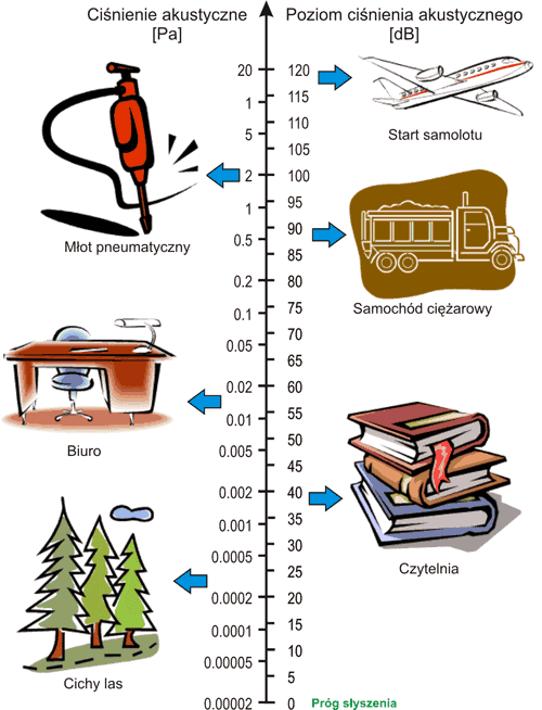 Rys. 4. Ciśnienia akustyczne i odpowiadające im poziomy ciśnienia akustycznego różnych dźwięków.