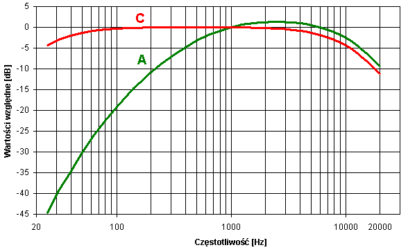 Ucho ludzkie reaguje w różny sposób na dźwięki o różnych częstotliwościach. Przy niskich poziomach dźwięku najlepiej odbieramy te o częstotliwościach od 2 do 4 kHz. Właściwości ludzkiego ucha sprawiają, że dźwięk o częstotliwości 2 kHz i poziomie ciśnienia akustycznego równym 30 dB wydaje się nam tak samo głośny jak dźwięk o częstotliwości 100 Hz i poziomie około 50 dB. Im większe są poziomy ciśnienia akustycznego dźwięków, tym te różnice wydają się mniejsze. Aby uwzględnić czułość ucha ludzkiego na dźwięki w zależności od ich częstotliwości i poziomu ciśnienia akustycznego wprowadzono krzywe korekcyjne. Najczęściej stosowane - A i C pokazano na Rys. 5.